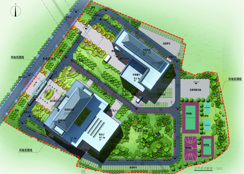 黨校新校區項目選址于桃花源街道東流口村4組(小地名:五家灣),距離現黨校有11.8公里,項目用地面積為48.5畝?偨ㄖ娣e:25613.00m2(其中綜合樓建筑面積:11871.00m2,學苑賓館建筑面積:13742.00m2),設計綜合樓1棟、學苑賓館1棟、地下車庫、大門,能滿足培訓、辦公、會議、就餐和住宿等功能。